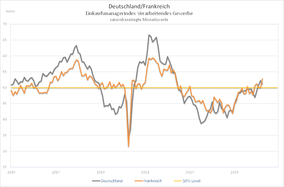Die Stimmung der Unternehmen des Verarbeitenden Gewerbes war im April vor dem Hintergrund der merklichen Widrigkeiten wie der Krieg im Nahen Osten in weiten Teilen überraschend gut. Schon die jüngst veröffentlichten regionalen US-Indizes aus Philadelphia und New York ließen mit einem überraschend deutlichen Anstieg aufhorchen. Nun kehrte laut heutigen Daten Australien mit einem Einkaufsmanagerindexwert von 51,0 Punkten in die Expansionsphase zurück, Japans Industrie machte einen Sprung um satte 3,3 auf 54,9 Punkte (51-Monatshoch) nach oben und Indien hat sich vom Rückgang im März mit einem Plus von Höhe von 2,1 auf 55,9 Punkte im Reigen der Wachstumsmotoren zurückgemeldet. Die heute noch im Tagesverlauf zur Veröffentlichung anstehenden PMIs aus Großbritannien und den USA dürften dieses Bild bestätigen.