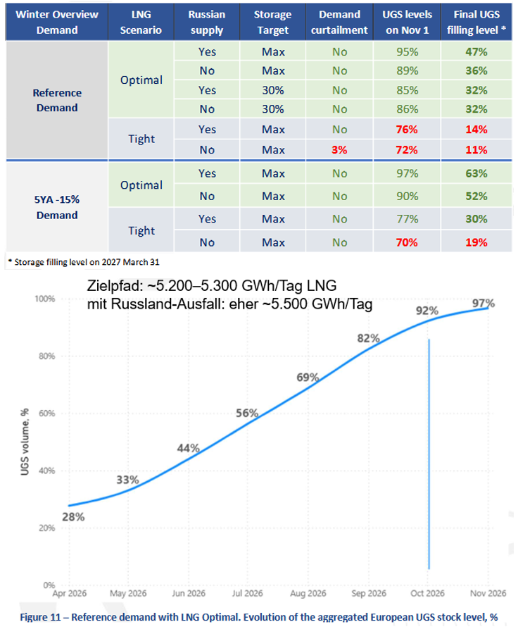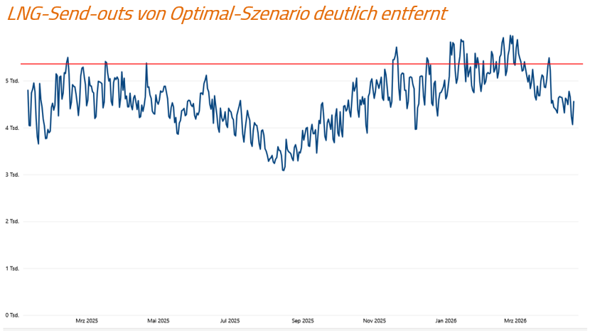 Vor diesem Hintergrund erscheinen die aktuell beobachteten LNG-Importe von rund 4.200 bis 4.600 GWh pro Tag als eher verhalten. Sie liegen unter dem Niveau, das im Referenzszenario implizit erforderlich wäre, um die Speicher auf komfortable Weise zu füllen. Zwar zeigen einzelne Tage auch höhere Zuflüsse, doch fehlt bislang die notwendige Konstanz auf hohem Niveau. Sollte sich dieses Bild über einen längeren Zeitraum fortsetzen, würde dies den Speicherpfad zunehmend unter Druck setzen. Die Entwicklung deutet damit eher in Richtung eines angespannten Szenarios, wie es in der Studie unter eingeschränkter LNG-Verfügbarkeit beschrieben wird. Entscheidend wird daher sein, ob die LNG-Zuflüsse im weiteren Verlauf des Sommers nachhaltig auf ein höheres Niveau ansteigen.