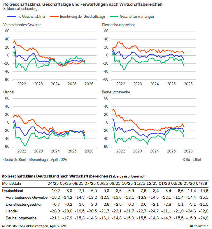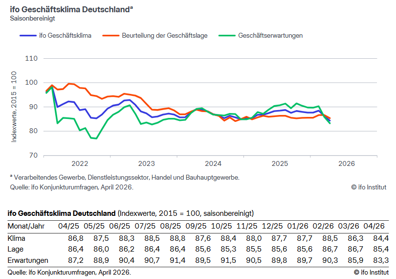 Die Stimmung unter den Unternehmen in Deutschland hat sich im April spürbar verschlechtert. Der ifo-Geschäftsklimaindex sank auf 84,4 Punkte nach 86,3 im März und erreichte damit den niedrigsten Stand seit Mai 2020, also zu Zeiten der Corona-Pandemie. Sowohl die Einschätzung der aktuellen Lage als auch die Erwartungen für die kommenden Monate fallen deutlich pessimistischer aus, nicht zuletzt infolge der Belastungen durch die Irankrise.