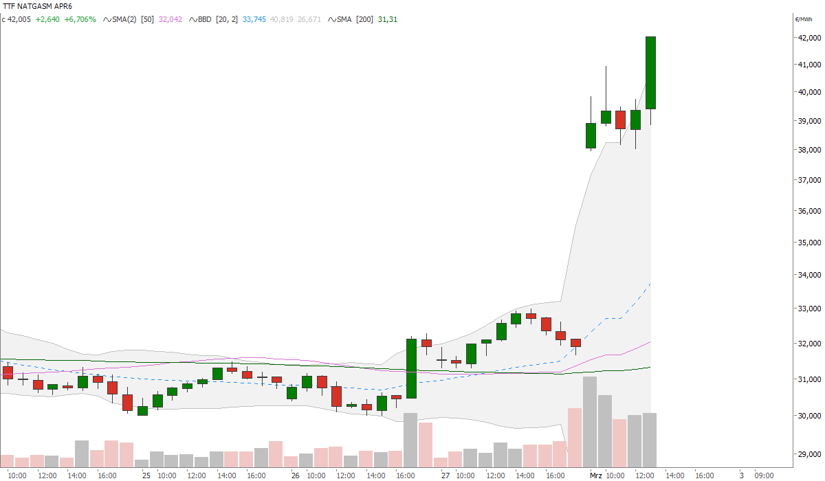 Diesmal wird die Preisreaktion weniger extrem ausfallen, da ein Hormus‑Shutdown nur temporär wäre. QatarEnergy gab am Montag um 13:05 Uhr bekannt, die LNG-Produktion aufgrund von Angriffen auf Anlagen eingestellt zu haben. Der Chart zeigt den Stundenchart des TTF Gas April-Futures, welche zum Zeitpunkt der Erstellung dieser Analyse ein neues Intraday-Hoch verzeichnet und auf über 42 Euro/MWh ansteigt.