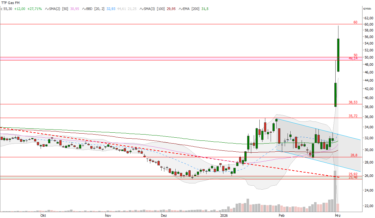 Der TTF Gas Future für April hat am Dienstag den zuvor hart umkämpften psychologischen Widerstand bei 50 Euro/MWh überzeugend nach oben durchbrochen und in der Folge unmittelbar die nächste Marke im Bereich von 60 Euro/MWh angesteuert. Im bisherigen Tageshoch erreichte der Kontrakt 59,45 Euro/MWh, woraufhin erste Gewinnmitnahmen einsetzten. Im kurzfristigen 5‑Minuten‑Chart läuft aktuell eine Konsolidierung, die den Kurs bis an das 38,2%-Fibonacci‑Retracement bei 53,92 Euro/MWh zurückgeführt hat. Dort bildet sich zunächst eine technische Stabilisierung aus.
