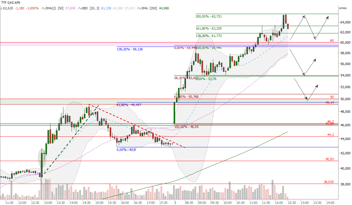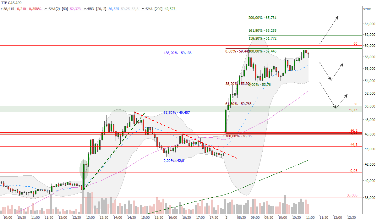 Der TTF Gas April Future steht knapp unter der Marke von 60 Euro/MWh. Ein Ausbruch darüber würde neue Kursziele mittels einer Fibonacci-Extension-Analyse bei 61,77 (138,2%), 63,25 (161,8%) und 65,73 Euro/MWh (200%) definieren. Ein erster relevanter Support findet sich bei 53,76 Euro/MWh und darunter bei 50 Euro/MWh. Chart: 5-Minuten-Chart des TTF Gas April Futures