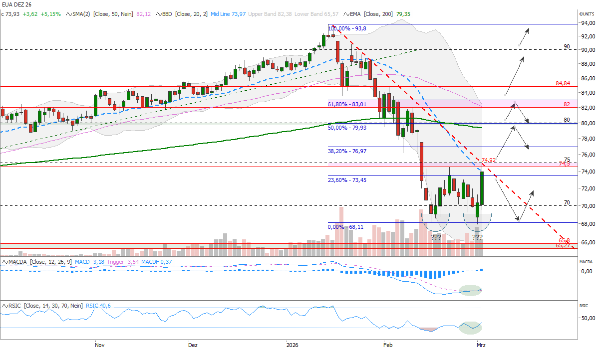 Der EUA-Dez‑26‑Kontrakt arbeitet sich nach dem massiven Einbruch von 93,8 Euro/t CO2 auf 68,11 Euro/t CO2 in eine potenzielle Bodenbildungsphase vor. Im Chart zeichnet sich im Bereich von 68 Euro/t CO2 eine mögliche Doppelboden‑Formation ab, die von einer Erholung im RSI und einem Kaufsignal beim MACD untermauert wird. Gelingt eine Bestätigung dieses Musters mit einem Preisanstieg über 75 Euro/t CO2, wäre dies ein relevantes Signal für eine nachhaltigere technische Gegenbewegung. Auf der Oberseite verlaufen mehrere markante Widerstände. Die Nackenlinie der Doppelboden-Formation kann auf 75 Euro/t CO2 taxiert werden. Eine Überwindung dieses Levels würde den rot gestrichelten Abwärtstrend beenden und hätte zudem einen Anstieg über das mittlere Bollinger Band zur Folge. Daraufhin folgt die Zone um 77 Euro/t CO2 (38,2%) und 79,9 Euro/t CO2 (50%), wo zudem der fallende 200‑Tage‑EMA (79,36 Euro/t CO2) verläuft. Ein Anstieg über diese Cluster‑Zone um 80 Euro/t CO2 wäre charttechnisch als mittelfristiges Trendwendesignal zu werten und könnte den Weg in Richtung Trendhoch bei 93,8 Euro/t CO2 öffnen. Auf der Unterseite bildet der Bereich um 68 Euro/t CO2 die zentrale Unterstützung. Ein Rutsch darunter würde die Bodenbildung negieren und Abwärtspotenzial in Richtung 66 Euro/ CO2 freisetzen. Insgesamt deutet das Setup bislang auf eine eher fragile Erholungsphase hin, in der bullische Szenarien erst oberhalb von 80 Euro/t CO2 klar an Überzeugung gewinnen.