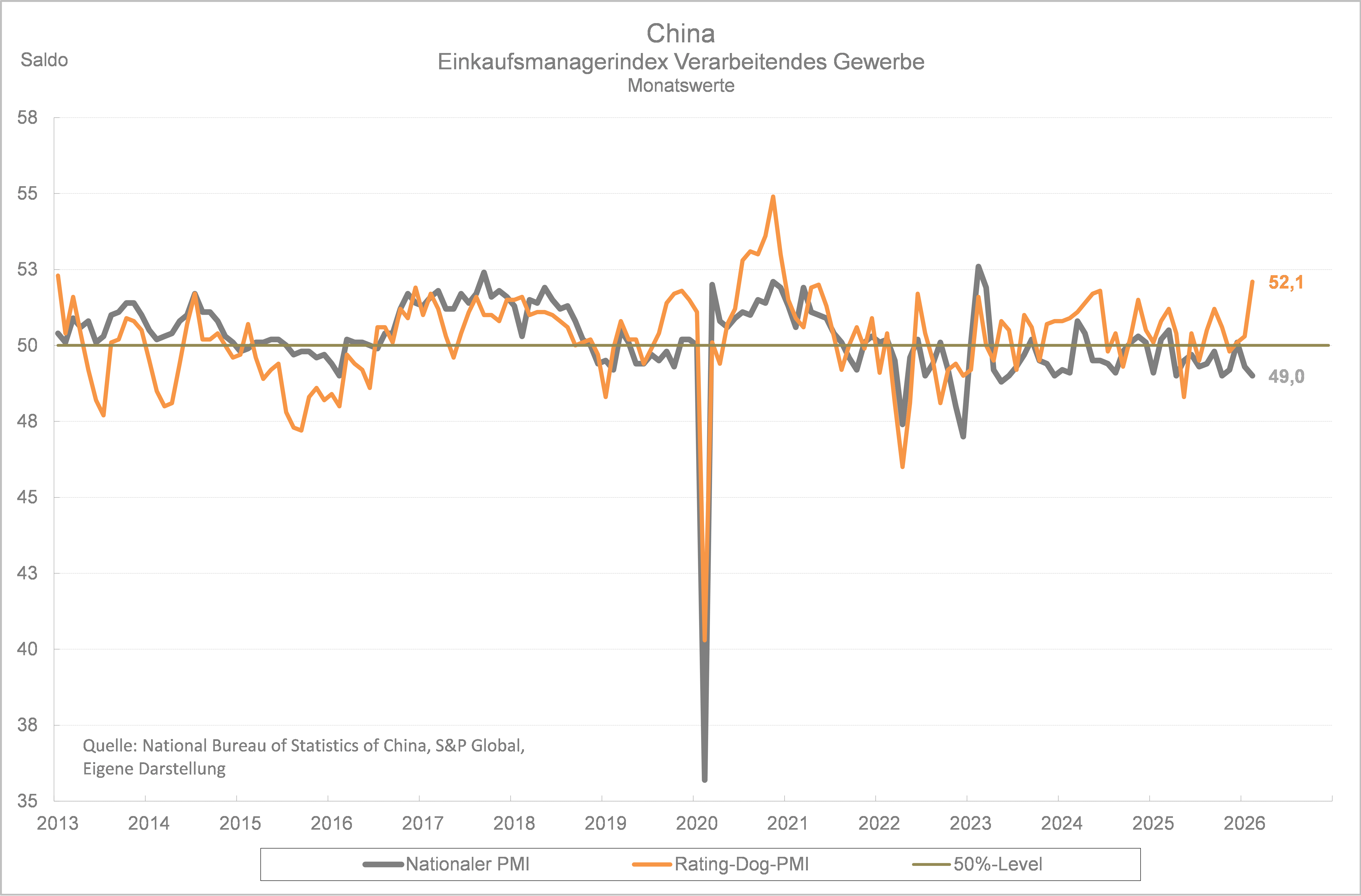Die Ergebnisse der Februarumfrage unter den Unternehmen des Verarbeitenden Gewerbes in China fiel ungewöhnlich stark unterschiedlich aus. Während der offizielle nationale Einkaufsmanagerindex (PMI) auf 49,0 Punkte fiel, schnellte das von S&P Global erhobene, private Maß auf 52,1 Punkte nach oben. Während der Nationale PMI rund 3.000 Unternehmen umfasst und am Ende des Monats die Daten erhebt, ist der sogenannte „RatingDog“ PMI exportorientierter, erfasst die Daten zur Mitte des Monats und umfasst lediglich 650 Unternehmen. In der Regel senden beide Indizes keine unterschiedlichen Signale, daher ist das divergierende Februar-Ergebnis durchaus bemerkenswert.