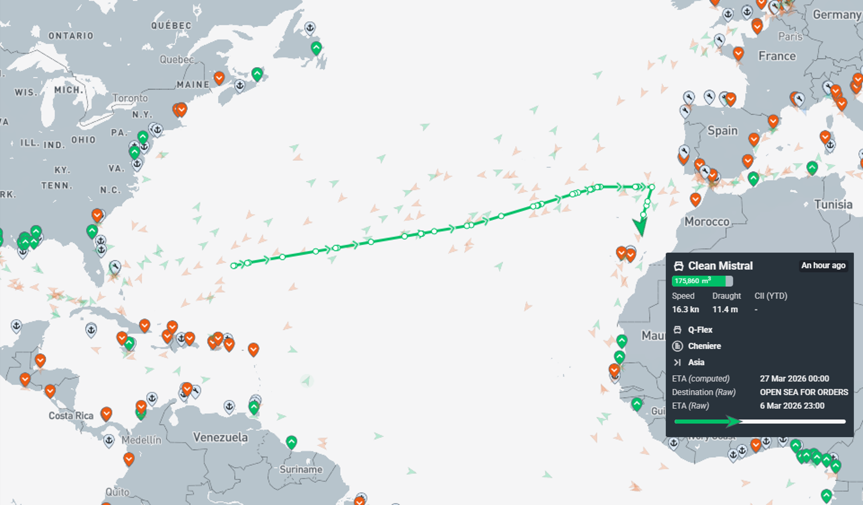 Wie bereits gestern beschrieben, hat die BW Brussels eine nigerianische Ladung aus Bonny LNG übernommen und schwenkte laut Kpler-Daten am 3. März 2026 von seiner ursprünglichen Route nach Montoir (Frankreich) ab. Der Tanker steuert nun Richtung Asien. Laut Kpler-Daten werden nun auch mindestens zwei weitere Tanker aus den USA umgeleitet (Clean Mistral von Corpus Christi und SIMSIMAH von Plaquemines). Hintergrund ist der starke Preisaufschlag in Asien. Für den Mai-Future lag der JKM-TTF-Spread zum Settlementpreis am Mittwoch bei 9,28 Euro/MWh.