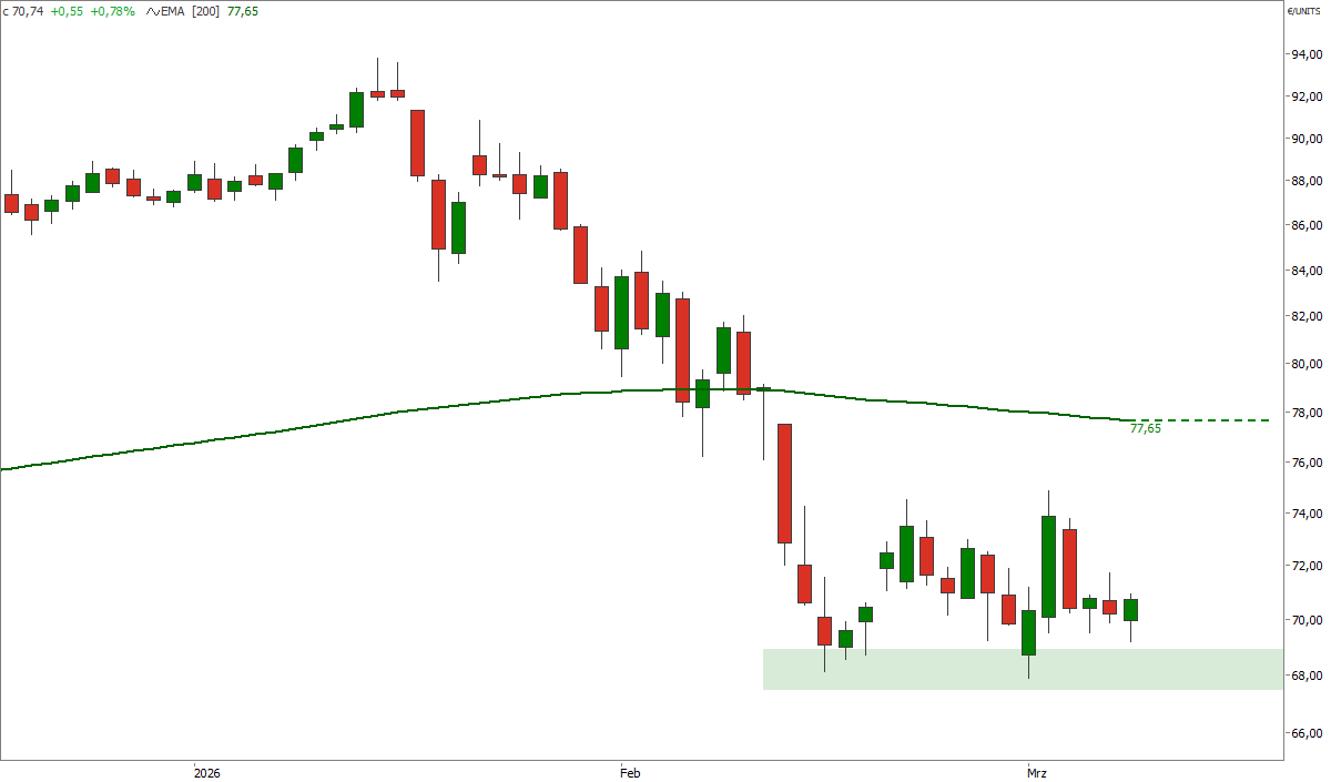 Im Gegensatz zu Strom und Gas reagiert der CO2-Markt kaum auf die derzeitigen Ereignisse in Nahost. Weiterhin hält sich der EUA-Dez-26-Future oberhalb der Support-Zone bei 70-68,11 Euro/t CO2 und notiert am Montag der aktuellen Handelswoche im Bereich der 70-Euro-Marke. Mit dem politischen Gegenwind für den Klimaschutz, einem drohenden Rezessionsszenario durch die Öl- und Gaspreiskrise und schwachen Finanzmärkten bleibt der CO2-Markt aber fundamental angeschlagen. Da allerdings bezüglich der ETS-Reformen noch viel Unklarheit herrscht, bieten sich Preisrücksetzer auf die benannte Unterstützung weiterhin als Kaufgelegenheit an. Unterhalb von 68,11 Euro/t CO2 trübt sich das Chartbild auch unter langfristigen Gesichtspunkten erheblich ein.