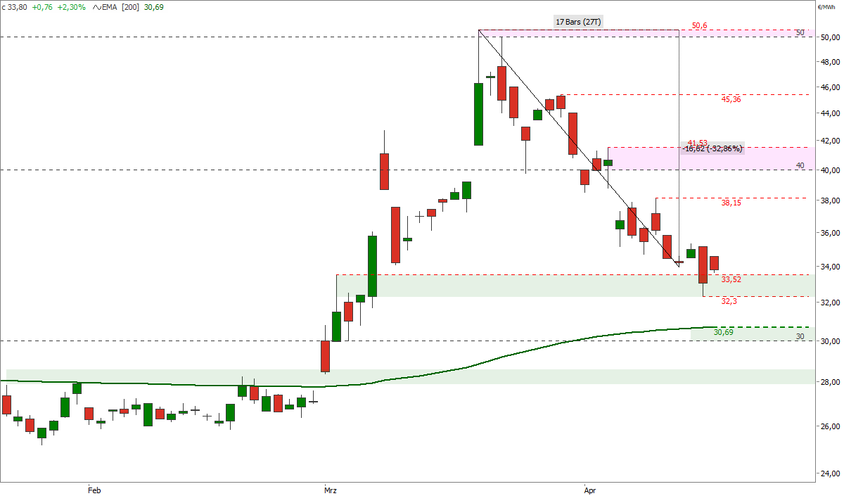 In der vergangenen Woche drückte die Hoffnung auf neue Friedensverhandlungen zwischen den USA und dem Iran auf die Notierung des TTF Gas Cal 27 Futures. Für erhebliche Irritation sorgten zudem die Meldungen am Freitag, dass die Straße von Hormuz während des laufenden Börsenhandels kurzfristig geöffnet und unmittelbar nach Handelsschluss wieder geschlossen wurde. Insofern bleibt die Lage unübersichtlich. Wir rechnen aus fundamentaler Sicht nicht mit einer schnellen Rückkehr auf das Preisniveau von vor dem Krieg. Die Lage bleibt fragil, sodass sich Preisrücksetzer weiterhin als Kaufgelegenheit anbieten. Dafür kommt der aktuelle Bereich bei 33,5–32,3 Euro/MWh in Frage, abgeleitet aus dem Reaktionshoch vom 3.3. und dem Wochentief der KW 16. Darunter kann der Bereich bei 30,7–30 Euro/MWh aus der 200-Tage-Linie und der psychologischen Marke für Hedging-Aktivitäten in Erwägung gezogen werden.
