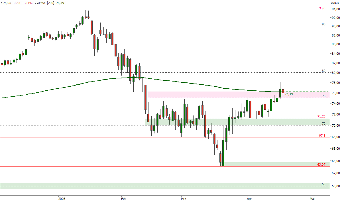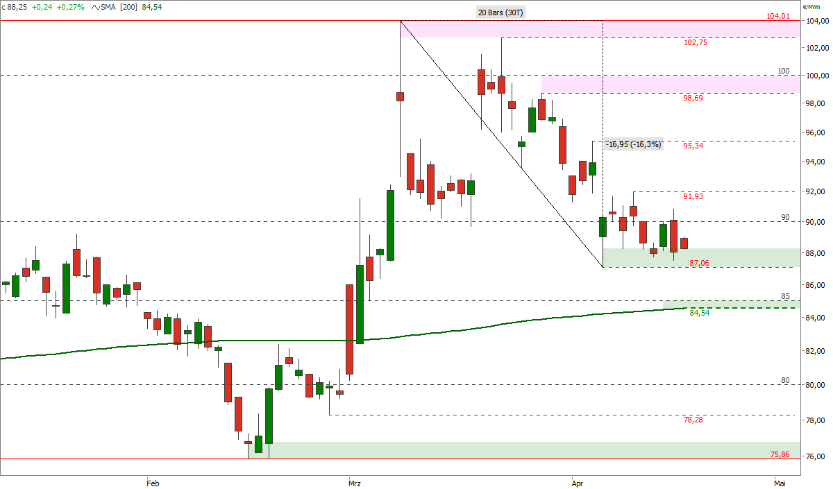 Beim EUA-Dez-Future bleibt derzeit die Oberseite der Trading-Range zwischen rund 70 und 75 Euro/t CO2 im Fokus. Zum Wochenabschluss der vergangenen KW 16 stieg der Dezember-Future auf 78,07 Euro/t CO2 im High und schloss bei 76,80 Euro/t CO2. Damit überwanden die EUAs sowohl die psychologische 75-Euro-Marke als auch die 200-Tage-Linie bei aktuell 76,19 Euro/t CO2, was bullish zu werten ist. Stützend wirkt die Euphorie der Finanzmärkte mit dem Ausblick auf weitere Friedensverhandlungen. Der Wochenauftakt der aktuellen KW 17 verläuft allerdings schwächer. Im Falle nachgebender Kurse der EUAs befindet sich an der 70-Euro-Marke weiterhin eine psychologische Unterstützung. Bei einem Rückfall darunter sollten die Tiefs aus Februar und März bei 68 Euro/t CO2 erneut Halt bieten können.
