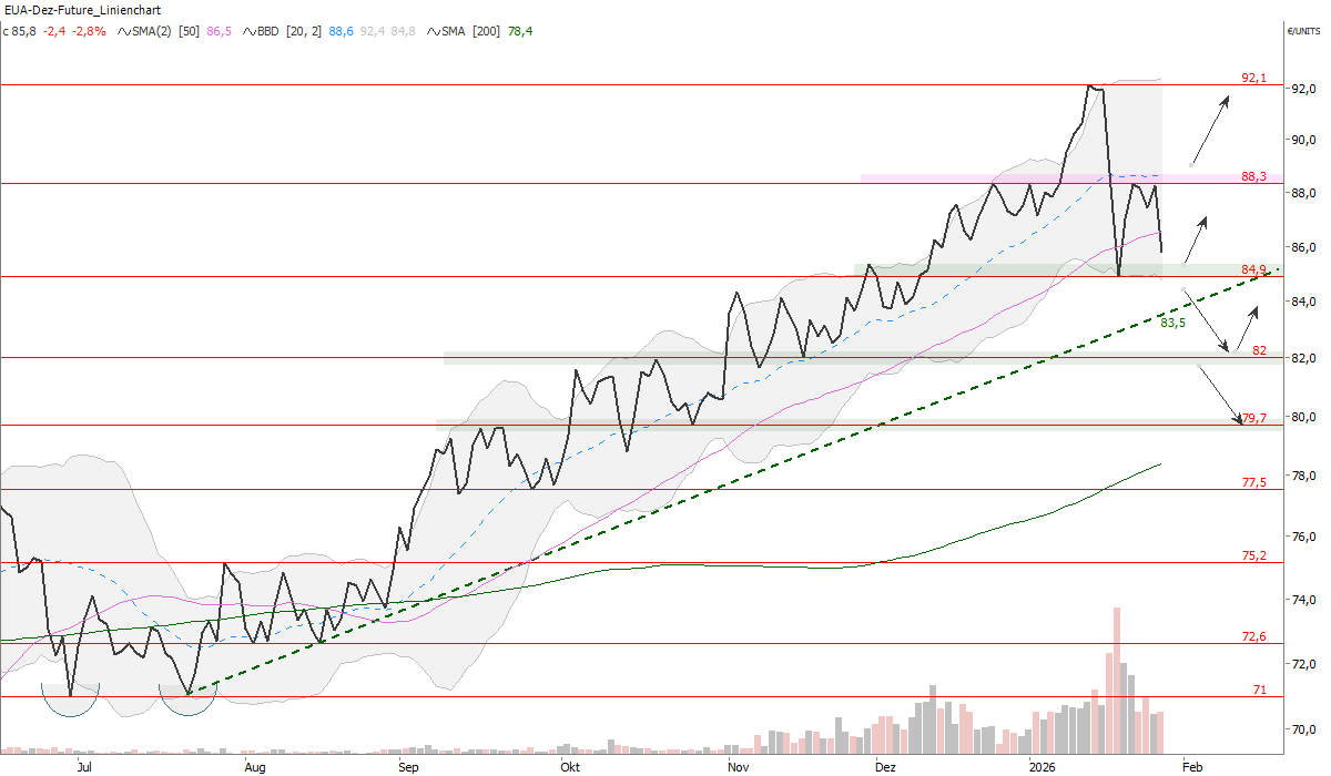 Der Tagesschlusskurs am Mittwoch lag bei 85,8 Euro/t CO2, also schon wieder deutlicher darunter. Damit kommt das CO2-Zertifikat der ersten relevanten Unterstützung bei 85 Euro/t CO2 wieder recht nahe. Hier befindet sich das Korrekturtief vom 20.01. (84,9 Euro/t CO2) in Kombination mit dem unteren Bollinger Band (84,8 Euro/t CO2). Auf diesem Kumulationssupport sollte Kaufinteresse feststellbar werden.