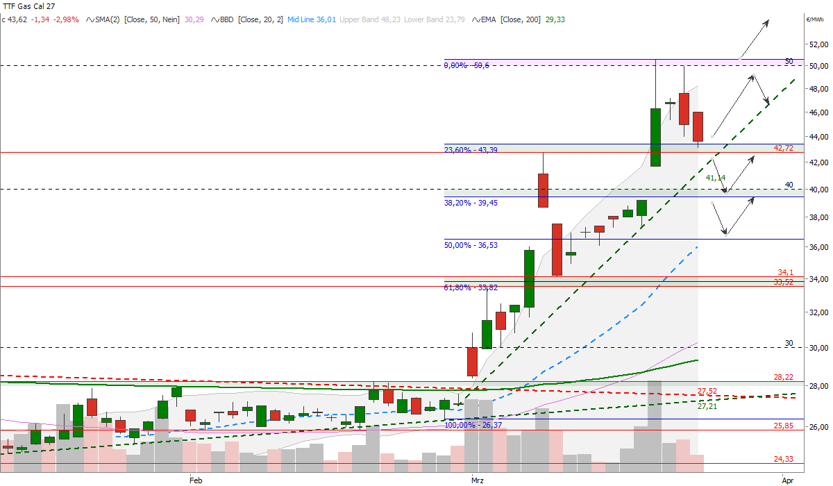 Aus charttechnischer Sicht dominiert nach wie vor das bullische Szenario, zugleich ist momentan die Rückschlagschance angesichts des Widerstands an der psychologischen 50-Euro-Marke erhöht. Ein nachhaltiger Anstieg über dieses Level würde den Aufwärtstrend weiter fortbestehen lassen und neue Kursziel auf der Oberseite definieren. Ein erster Support befindet sich im Bereich 43 Euro/MWh (23,6%-Fibonacci-Retracement), welcher am Dienstag angelaufen wurde. Unterhalb dieser Marke entstünde ein Verkaufssignal mit Kursziel 40 Euro/MWh (38,2%-Fibonacci-Retracement) und anschließend 36,5 Euro/MWh (50%-Fibonacci-Retracement).