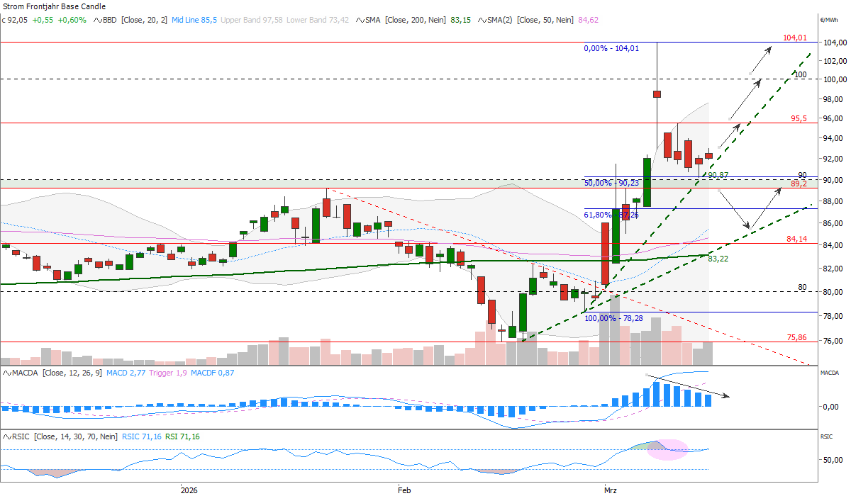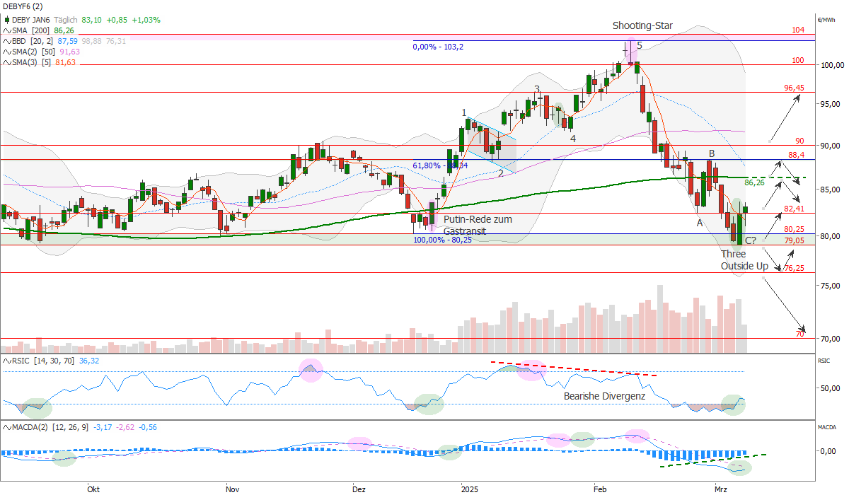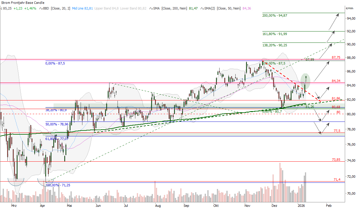 Ein Stromhändler sollte das übergeordnete bullishe Bild respektieren, solange sich die Kurse oberhalb der 200-Tage-Linie befinden. Long Setups bieten sich bevorzugt am Kumulationssupport um 81–81,0 Euro/MWh (200 Tage Linie, 38,2 %-Fibo, Dezember Tief) an, während unterhalb von 80 Euro/MWh Short Chancen in Richtung 79 und 77 Euro/MWh überwiegen. Ein Tagesschluss über 84,14 Euro/MWh würde dagegen wieder prozyklische Longs mit Ziel 87,5 Euro/MWh rechtfertigen.