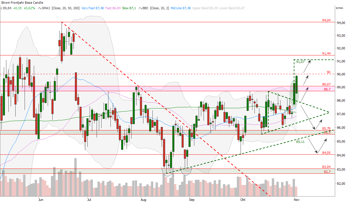 Durch die im Rückblick erwähnten Kaufsignale wird der seit Mitte August etablierte mittelfristige Aufwärtstrend weiter bestätigt. In der Folge könnte es in den nächsten Tagen bis 90 Euro/MWh (psychologische Marke) und 91,44 Euro/MWh (Mai-Hoch) aufwärts gehen. In der Eröffnung am Dienstag ging es bereits bis auf 89,75 Euro/MWh hinauf.