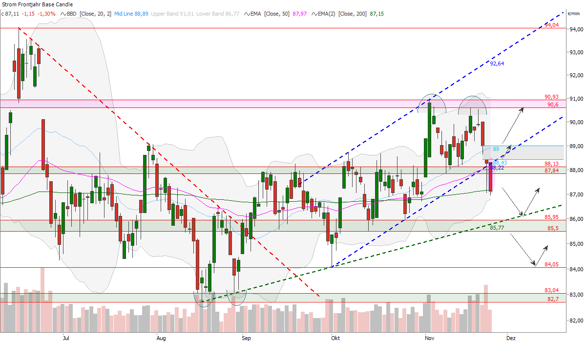 Ein Tagesschlusskurs unterhalb von 88 Euro/MWh hätte charttechnisch negative Konsequenzen zur Folge. Der blaue Aufwärtstrendkanal wäre gebrochen und die Kursentwicklung im November kann als bestätigte Doppeltop-Formation klassifiziert werden. Weitere Preisabgaben könnte die Folge sein und ein Test des Horizontal-Supports bei rund 86 Euro/MWh darf erwartet werden.