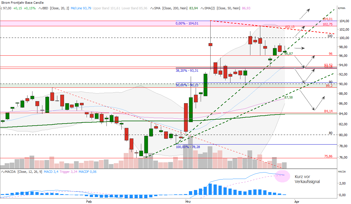 Im Falle weiter nachgebender Notierungen befindet sich der nächste Support sich bei 96 Euro/MWh. Am 19.03./23.03. und 24.03. zeigten sich in diesem Bereich regelmäßig auffällig längere Lunten in den Tageskerzen. Unterhalb von 96 Euro/MWh bildet das Tagestief vom Mittwoch vergangener Woche bei 93,52 Euro/MWh in Kombination mit den Hochs bei 93,15 Euro/MWh und dem 38,2%-Fibonacci-Retracement (93,31 Euro/MWh) einen stabilen Kumulationssupport, auf welchem das Kaufinteresse wieder ansteigen sollte.